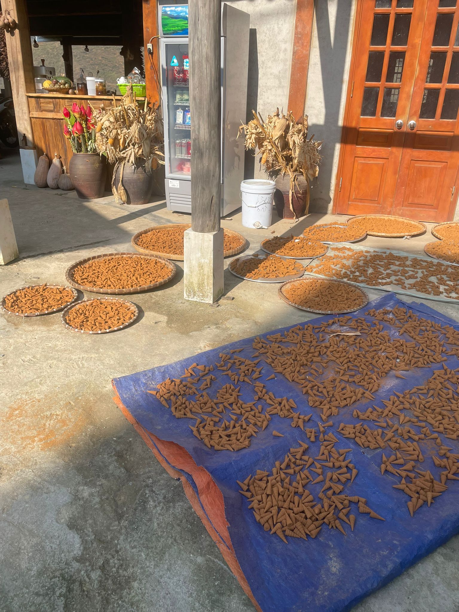 Nous sommes ensuite arrivées dans un premier village ethnique, où nous avons observé les femmes travailler devant leurs maisons. Cela nous a permis de découvrir les savoir-faire traditionnels de la population locale : la broderie et le tissage, la teinture naturelle à l’indigo, ainsi que la technique ancestrale du batik à la cire, qui consiste à dessiner des motifs à l’aide de cire d’abeille avant la teinture du tissu. Nous avons également visité un atelier équipé de machines en bois traditionnelles utilisées pour le tissage, la fabrication de la farine et le décorticage du riz, notamment grâce à des systèmes fonctionnant à l’eau.