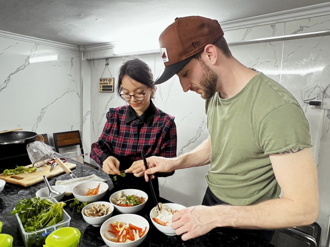 8h30 - 11h30 / 14h00 - 16h30 : Après la visite du marché, rendez-vous en cuisine pour un cours de cuisine. Votre professeur vous montrera comment préparer quatre plats vietnamiens classiques (rouleaux de printemps frits, salade de papaye, rouleaux de pho, pho mixte et un café aux œufs vietnamien.