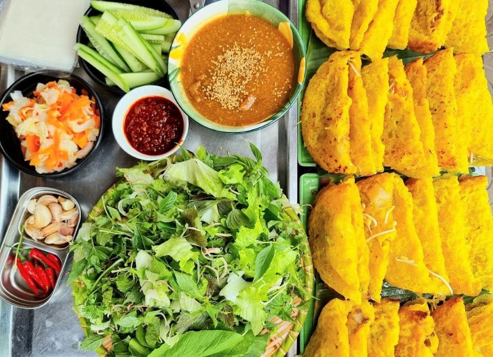 - La Rose Blanche est l'une des spécialités les plus célèbres de la vieille ville de Hoi An. Elle est inspirée des raviolis chinois, créés par les Chinois venus s'installer à Hoi An pour y développer leur activité. Le Bánh xèo est une crêpe de riz croustillante et fourrée, très populaire au Vietnam. Son nom fait référence au bruit que produit une fine couche de pâte de riz lorsqu'on la verse dans la poêle chaude. C'est une crêpe salée frite, à base de farine de riz, d'eau et de curcuma.