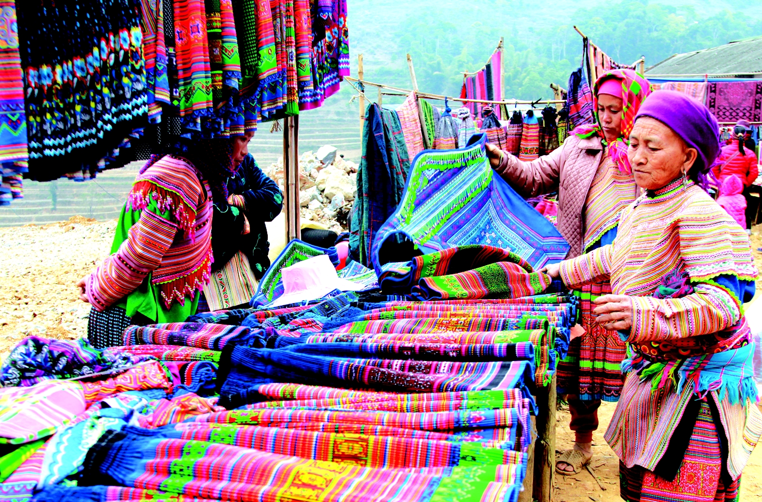 C’est un dimanche matin froid et brumeux lorsque j’arrive à Si Ma Cai, un petit bourg perché à la frontière du Vietnam et de la Chine. Le soleil perce lentement les nuages, révélant peu à peu les collines couvertes de rizières et de champs de maïs. Déjà, la route est animée : des femmes H’mong, Nùng, Phù Lá marchent en file, portant sur leur dos des paniers remplis de légumes, de poulets ou de tissus colorés. Toutes se dirigent vers le marché.