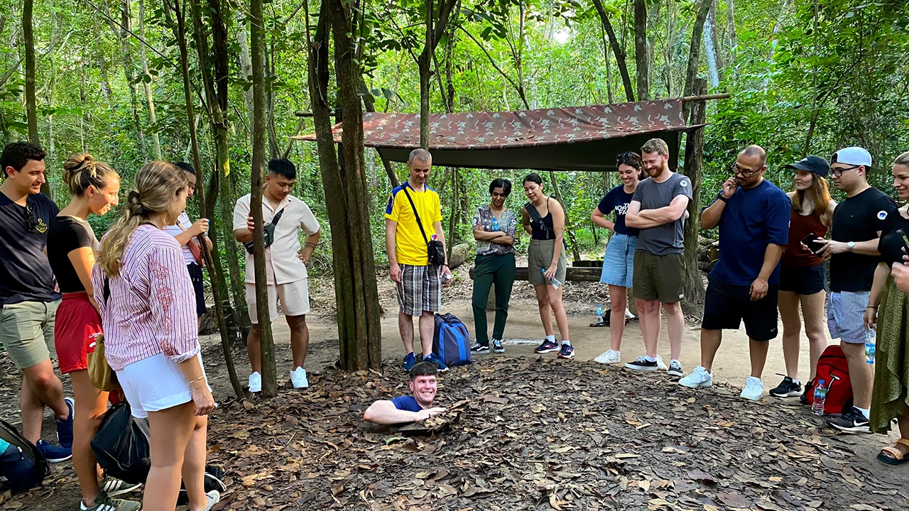 Départ à 8h00 des bureaux de Vietnam Adventure Tours ou prise en charge à votre hôtel pour les tunnels de Cu Chi, situés à 60 km de Hô Chi Minh-Ville. Cu Chi est aujourd'hui considéré comme un quartier héroïque pour son rôle dans la guerre du Vietnam. Célèbre pour son réseau de tunnels de plus de 220 km, c'est un lieu prisé des Vietnamiens et des étrangers.